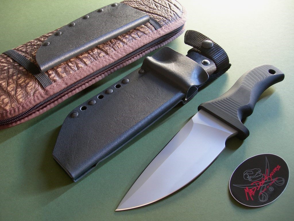 Summary: this is a Mad Dog Knives "Voodoo Frog" with a 6-1/8" hard chromed, double-edged blade that has the VVTL finish. Blade is perfect -- razor sharp edges with a type 3 choil. The black handle material is outstanding, compression bonded to the hidden full tang and incredibly ergonomic. 1/4" blade stock – overall length is right at 11". Mad Dog trademark on the ricasso, mint condition.