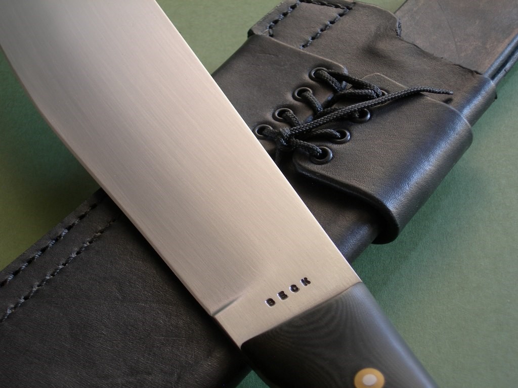 This awesome rare bolo is light in hand as it's made from 5/32" stock, very functional even though it's a hair over 15-3/4" overall length. It's really beautiful with the wet sanded blade and black micarta scales, serial #1 on the back with Dave’s “BECK” stamp on the front. Tapering tang with 2 piece Loveless pins and lined lanyard hole. Condition: unused with original edge, mint condition.