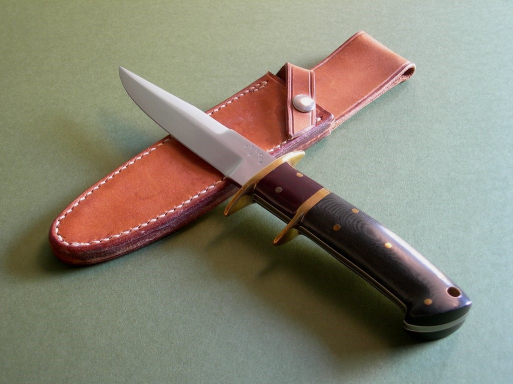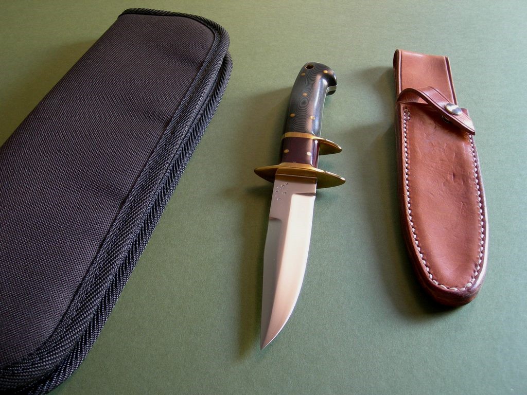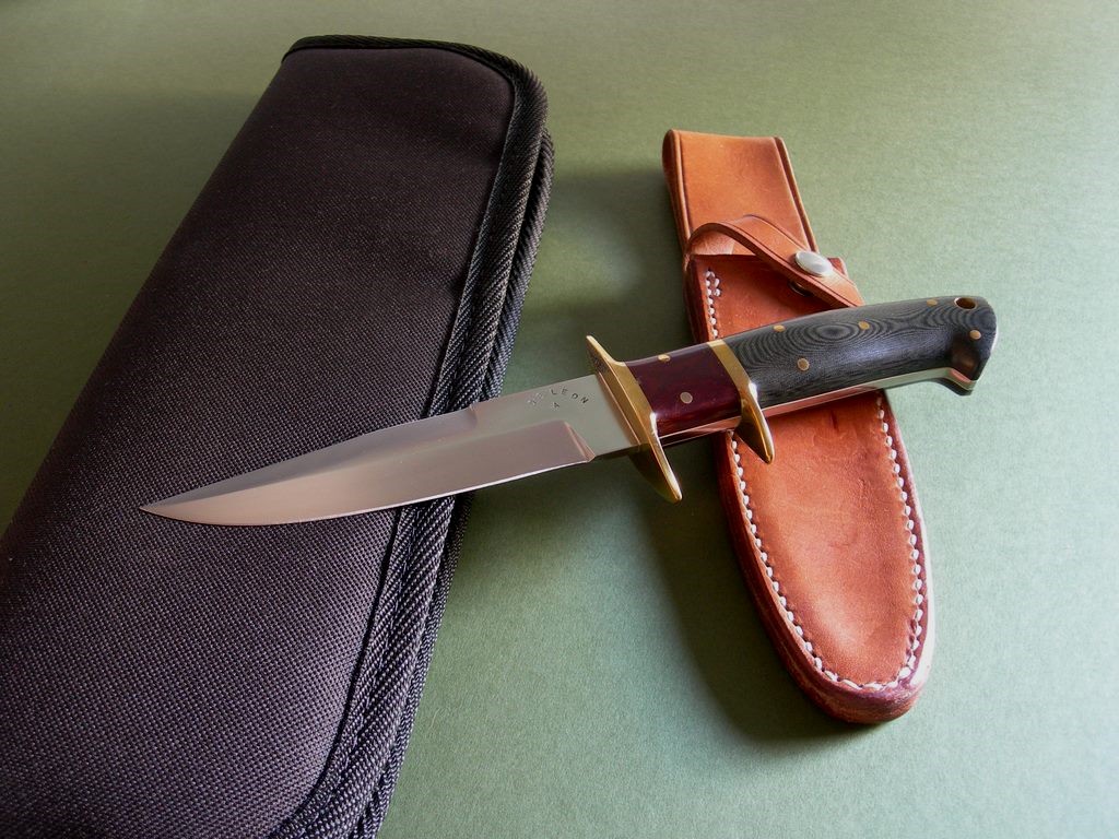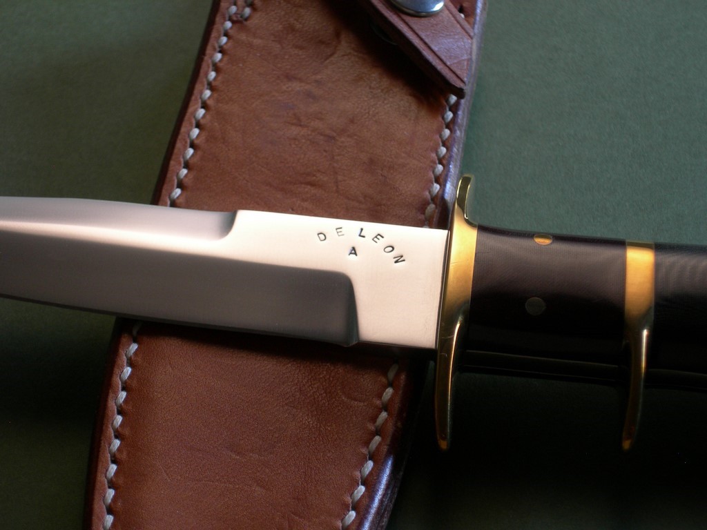 6 photos for review – as shown, a new black canvas carry case is included. This is a very interesting DeLeon model – these short-bladed subhilt A1's less common than those in the 6 to 8 inch blade lengths. This one's total eye candy with two color pinned micarta scales, priced to sell and a great knife for collection / investment purposes. Thanks and good luck.