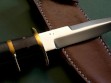Summary: this is an unused, nasty nice short-bladed A1 subhilt fighter made by the late Enedino DeLeon. This knife has an 5" double-edged blade (upper clip sharpened back approx. 3-1/2”), brass guards, and two color scales (maroon and black) on a non-tapering tang with white tang liners. It's a fabulous looking small fighter, overall length is 9-3/4". The blade is perfect with original edges, overall excellent+++ or better condition with just light wipe marks and patina on the brass hardware.