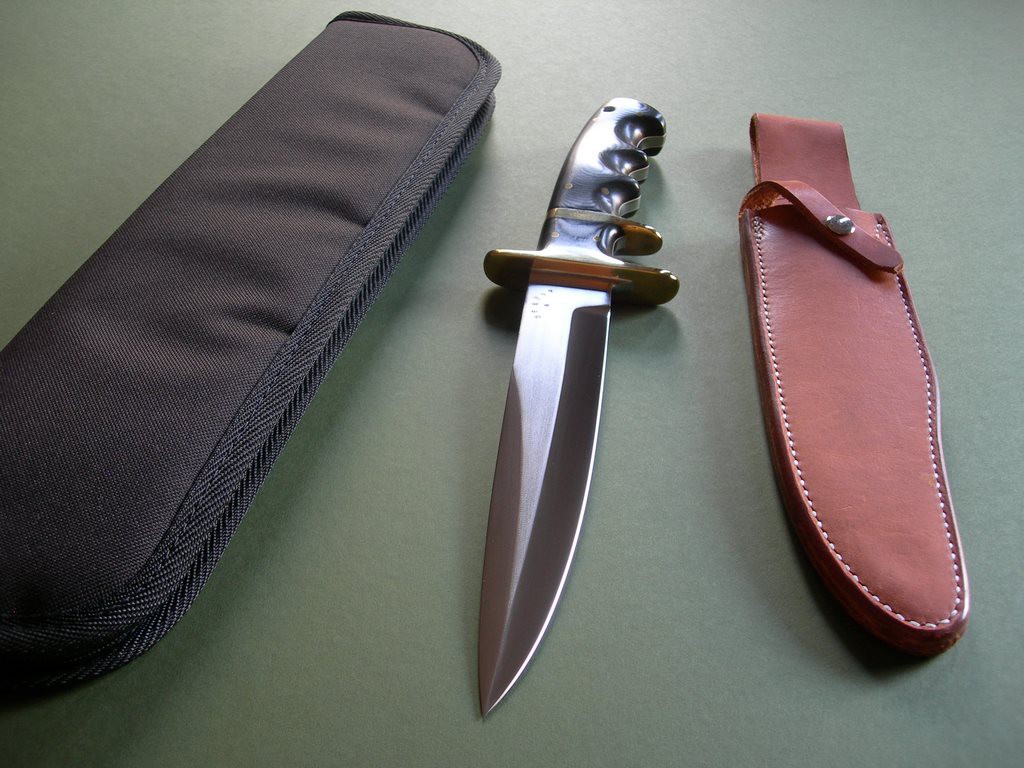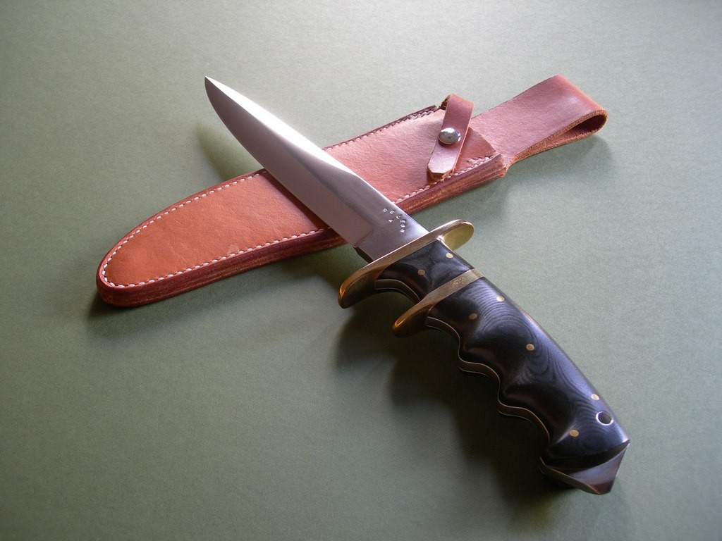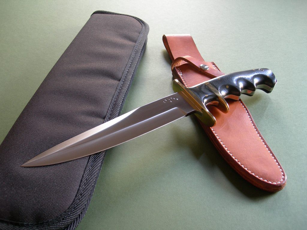 6 photos for review – as shown, a new black canvas carry case is included. This is a fantastic looking, large subhilt fighting knife with the fingered black micarta scales, a great knife for display or collection / investment purposes. Thanks and good luck.