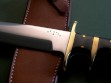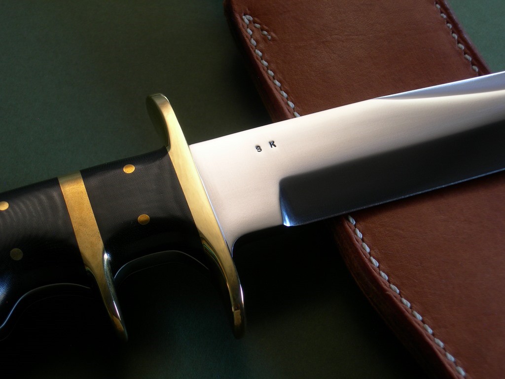 Summary: this is an unused model SK subhilt fighting knife made by the late Enedino DeLeon. This knife has an 8" blade (upper clip sharpened back approx. 2-3/4”), nickel silver guards, and fingered black micarta scales on a non-tapering skull crusher tang with white tang liners. This big ass subhilt is a handful, overall length is right at 13-7/8". The blade has the original edges, overall excellent+++ condition with just light handling / wipe marks on the nickel silver hardware.