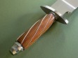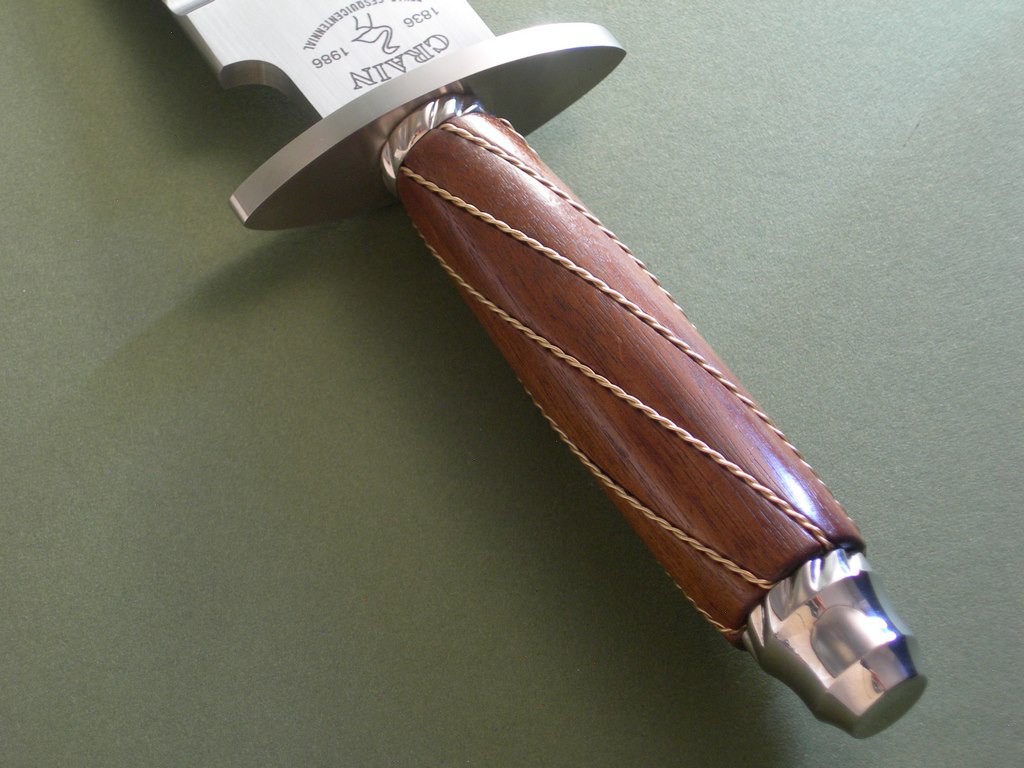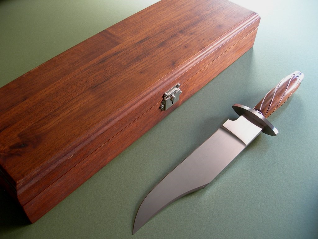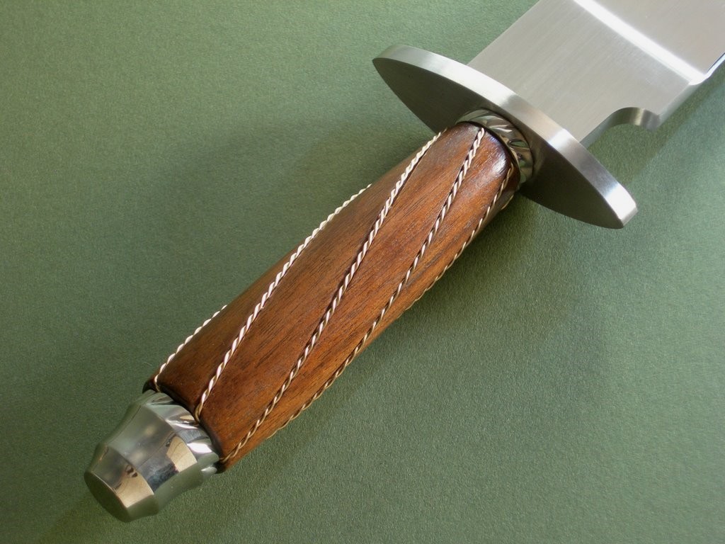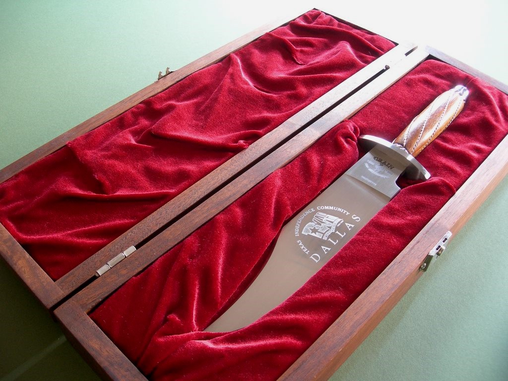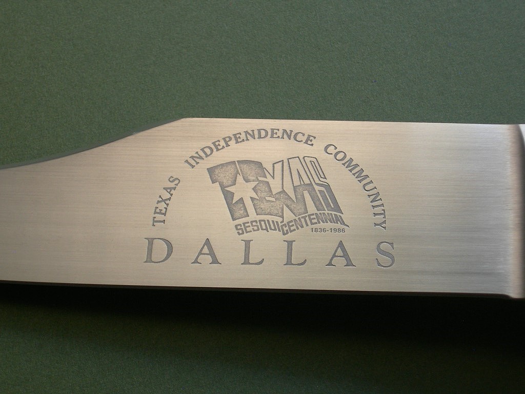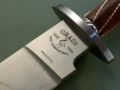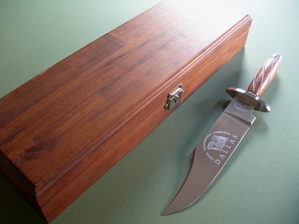 The knife features a 8-7/8" satin finish blade and is 14-1/8" overall length. Made from 1/4" blade stock with false (unsharpened) upper clip, stainless fittings and a beautiful custom wood handle. Blade markings and etching as shown in the photos, I've no idea if any other "DALLAS" Bowie knives were made.