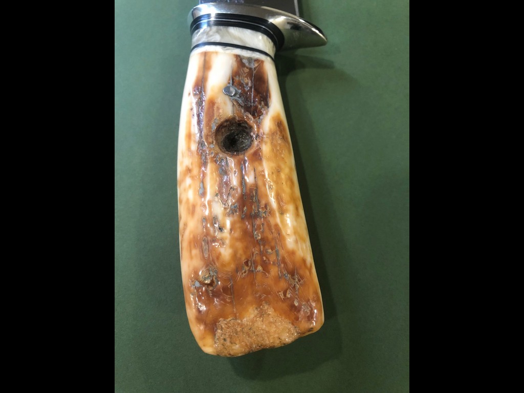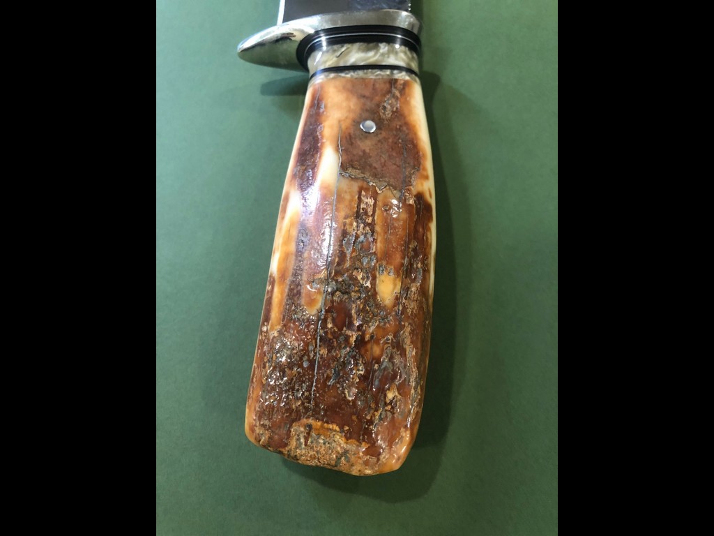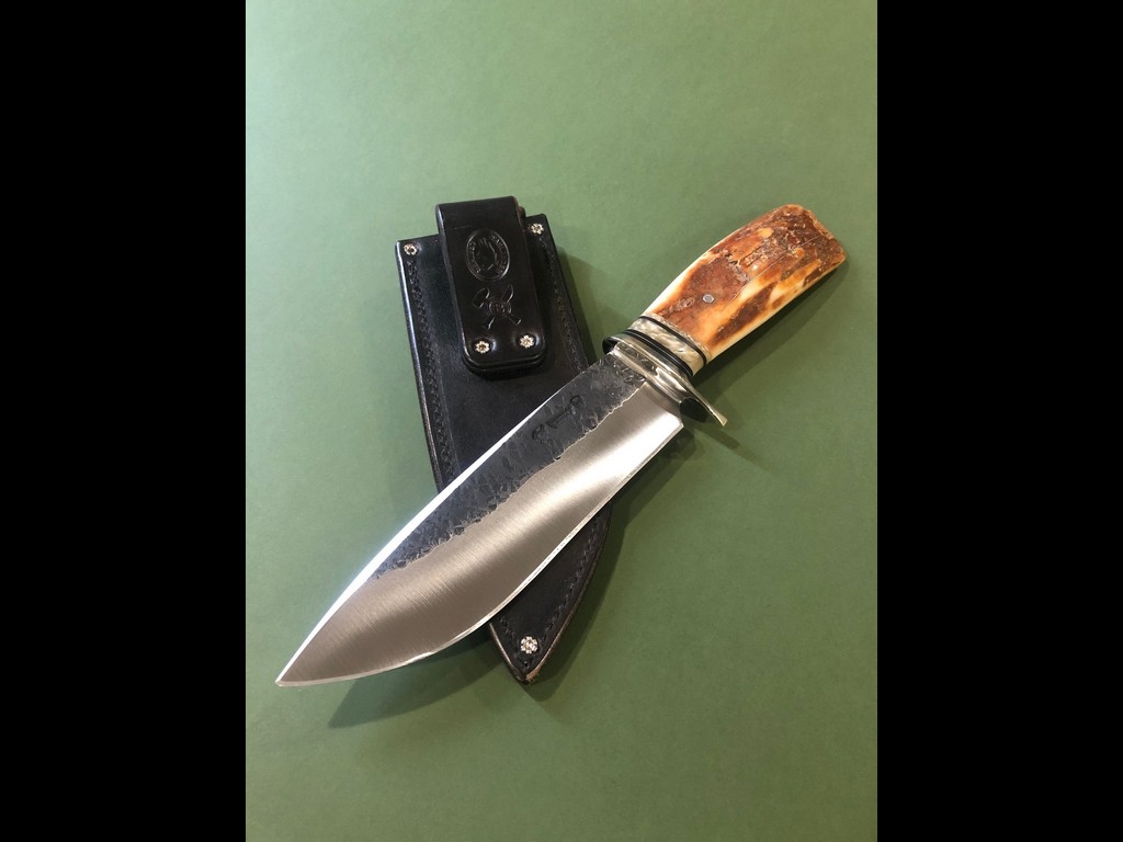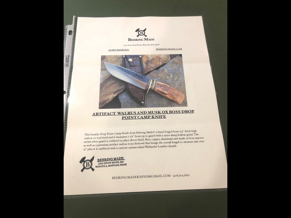 “This beastly Drop Point Camp knife from Behring Made is hand forged from ¼” thick high carbon 01 tool steel and it measures 7-1/2” from tip to guard with a razor sharp hollow grind. The nickel silver guard is soldered in place above the black fiber, copper, aluminum and musk ox boss spacers as well as a premium artifact walrus ivory fire bowl that brings the overall length to measure just over 13” Outfitted with a custom caiman inlaid Warlander Leather sheath.”
