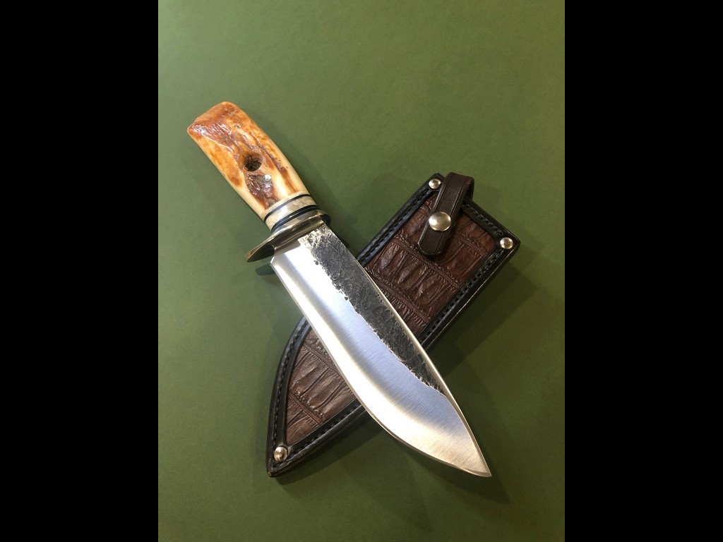 Summary: a beautiful BMK custom with large artifact fire bowl handle and custom caiman inlaid Warlander sheath. Photos and C.O.A. tell the story, see below. Pre-owned, properly stored. Both the knife and sheath are in mint condition.