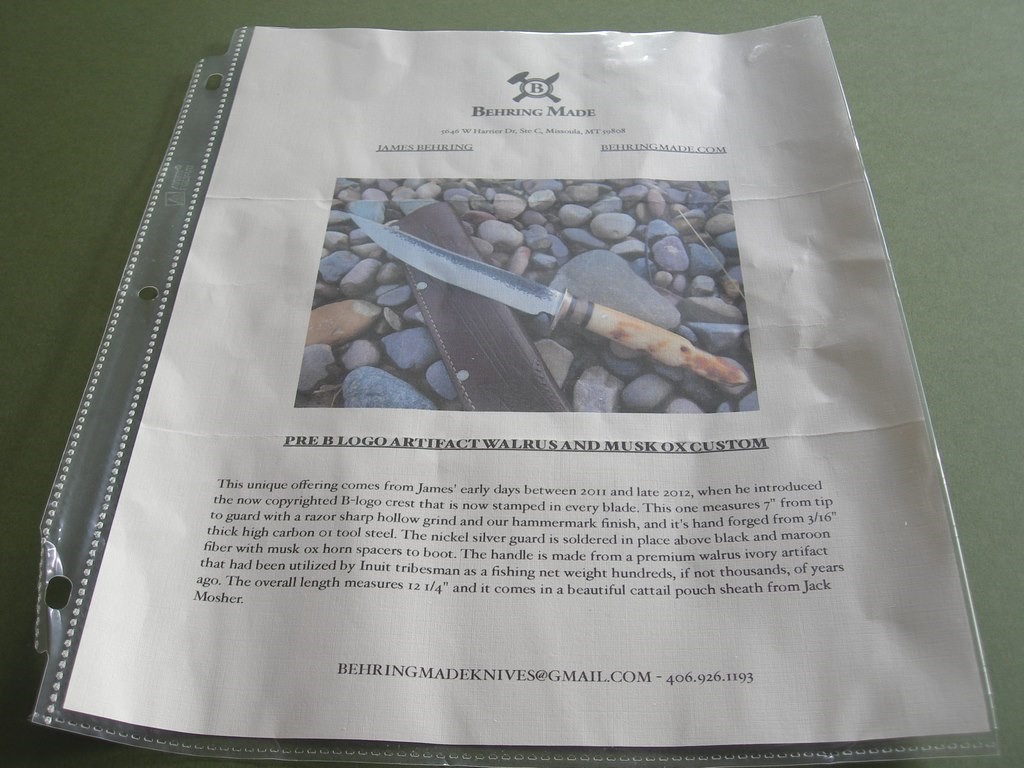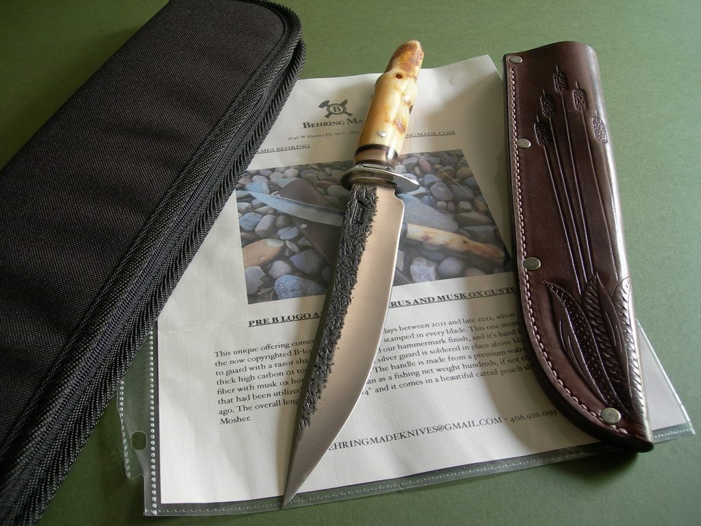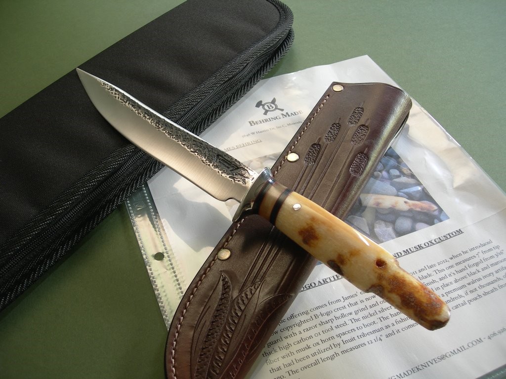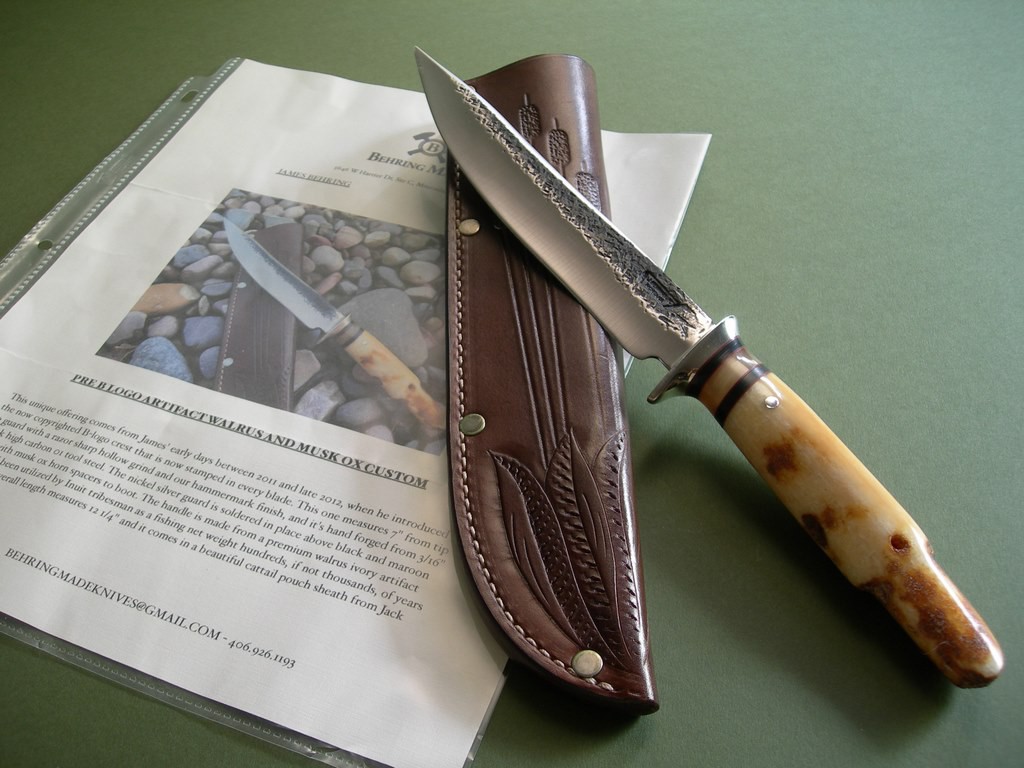 “This unique offering comes from James’ early days between 2011 and late 2012, when he introduced the now copyrighted B-logo crest that is now stamped in every blade. This one measures 7” from tip to guard with a razor sharp hollow grind and our hammermark finish, and it’s hand forged from 3/16” thick high carbon 01 tool steel. The nickel silver guard is soldered in place above the black and maroon fiber with the musk ox horn spacers to boot. The handle is made from a premium walrus ivory artifact that had been utilized by Inuit tribesman as a fishing net weight hundreds, if not thousands, of years ago. The overall length measures 12-1/4” and it comes in a beautiful cattail pouch sheath from Jack Mosher.”