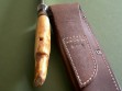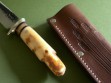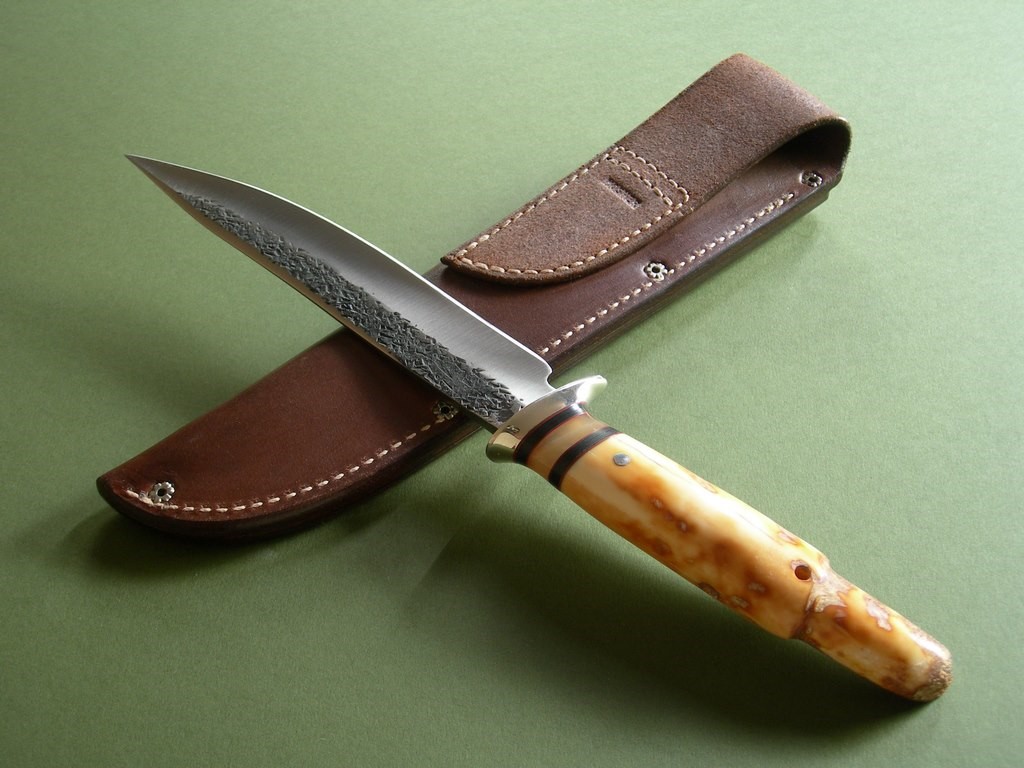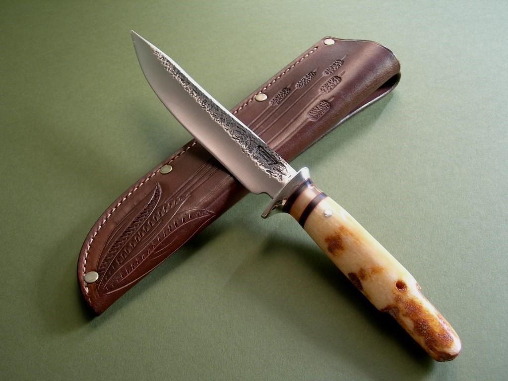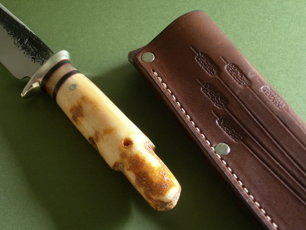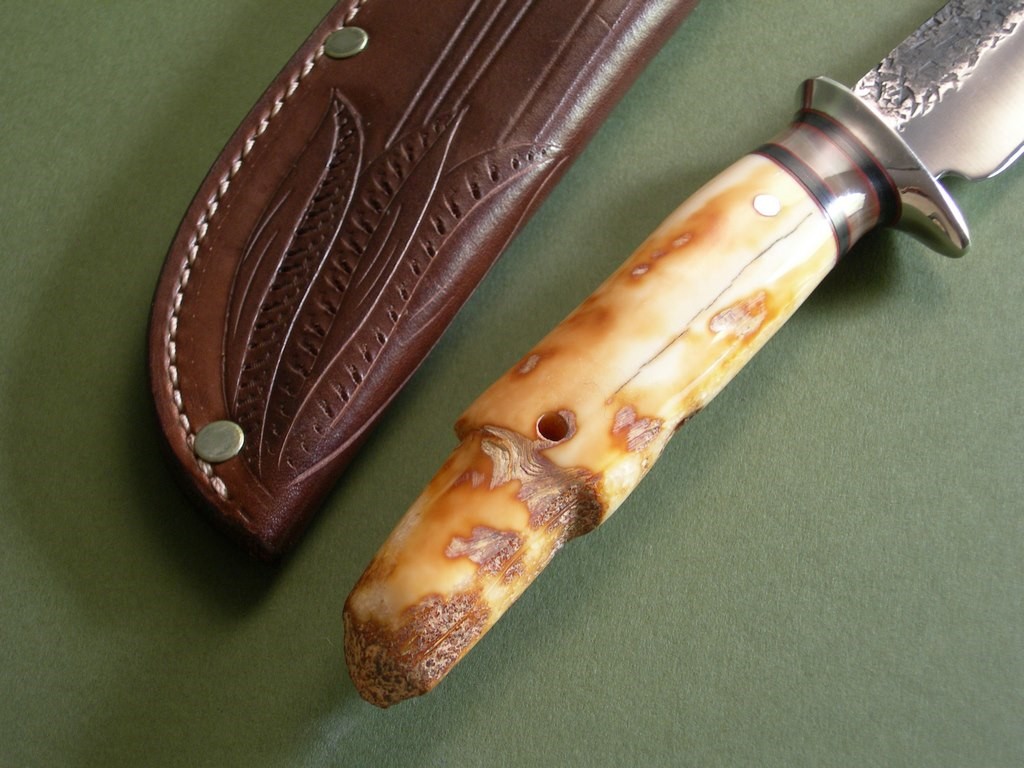 “This unique offering comes from James’ early days between 2011 and late 2012, when he introduced the now copyrighted B-logo crest that is now stamped in every blade. This one measures 7” from tip to guard with a razor sharp hollow grind and our hammermark finish, and it’s hand forged from 3/16” thick high carbon 01 tool steel. The nickel silver guard is soldered in place above the black and maroon fiber with the musk ox horn spacers to boot. The handle is made from a premium walrus ivory artifact that had been utilized by Inuit tribesman as a fishing net weight hundreds, if not thousands, of years ago. The overall length measures 12-1/4” and it comes in a beautiful cattail pouch sheath from Jack Mosher.”