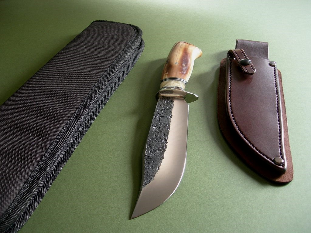 9 photos for review -- as shown, a new black canvas carry case is included. This is an awesome f-ing knife with the hammered bowie grind and gorgeous handle, a custom BMK perfect to tuck away for collection / investment purposes. Thanks and good luck.