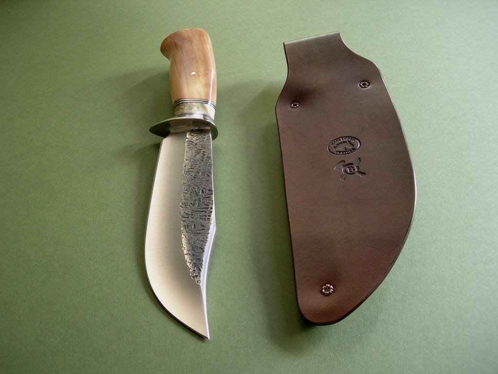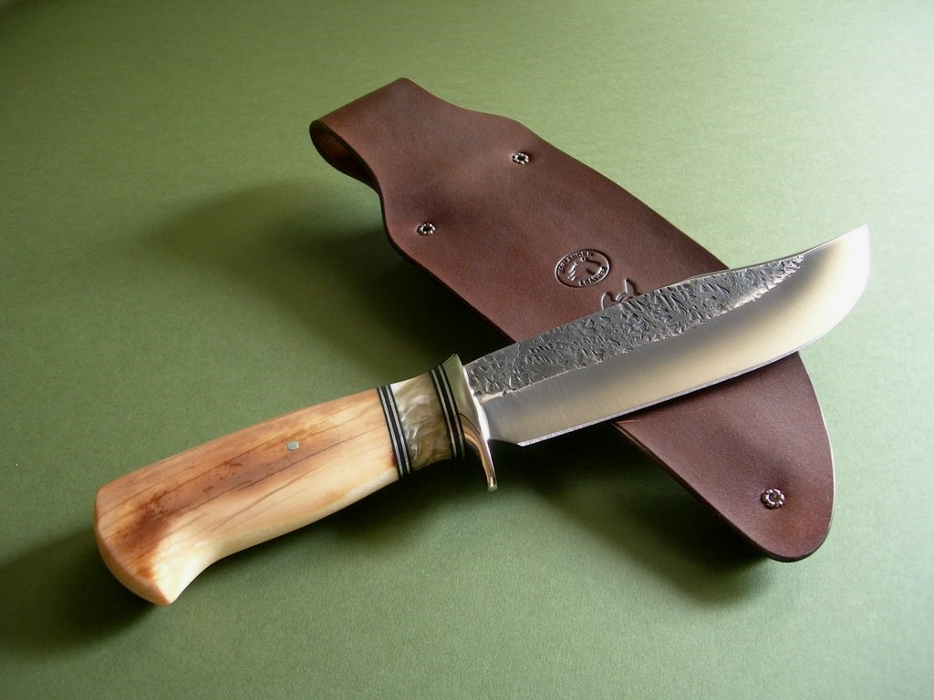 Summary: a beautiful BMK custom with a 7” hammer-marked bowie clip grind, nickel guard and fabulous stack with thick musk ox boss spacer. If that’s not enough, an awesome crow’s beak fossil walrus handle completes the knife. Made from ¼” stock and relatively heavy in hand, overall length is 12-1/4”. Pre-owned, properly stored, mint condition.