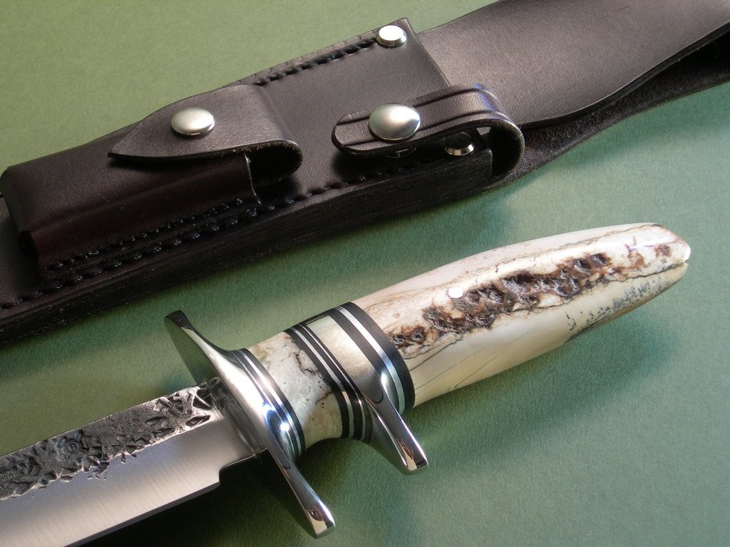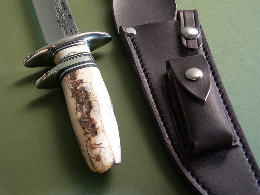 The knife is fitted to a custom riveted stone pouch sheath made by Warlander Leather. Silver rivets and snaps to match the nickel guards on the knife, an unused solid gray stone in the front pouch. Near mint condition, a light scuff or two at most.
