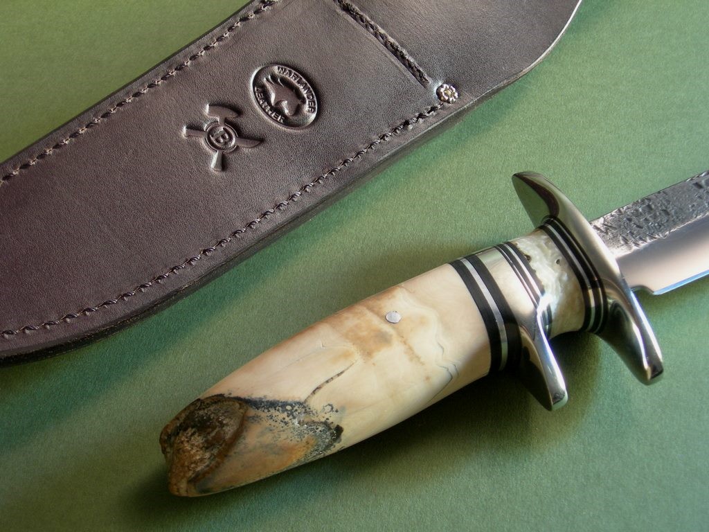Summary: an unused and relatively scarce subhilt fighting knife made by Behring Made Knives. There are a thousand ways to describe this knife, the simplest and most direct being "wickedly sharp, nasty nice eye candy". Made from 3/16” stock with an overall length of 12-3/4”, guards and handle finished to perfection. The fossil ivory handle is super nice with great color, the photos don’t do this beauty any justice! On consignment from the original owner who ordered the knife directly from BMK several years ago, this knife is in near mint condition with just a few light wipe marks on the nickel hardware.
