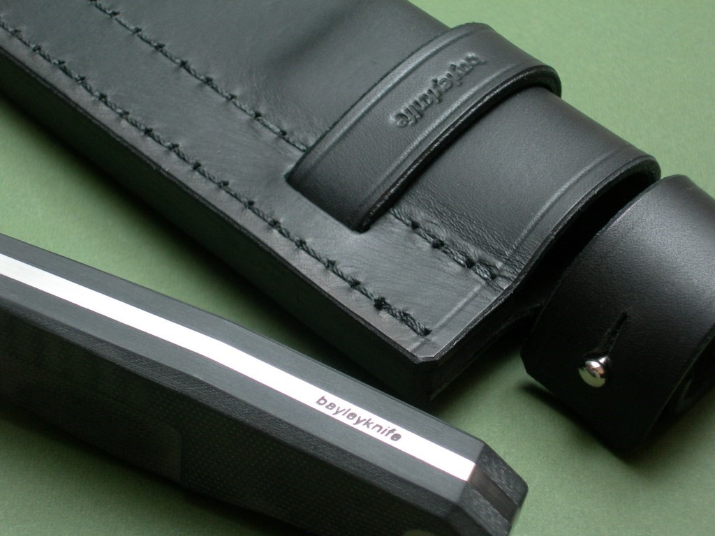 The knife has black G10 handle scales and it comes with a black leather survival sheath. Leather C.O.A. is included, of course.