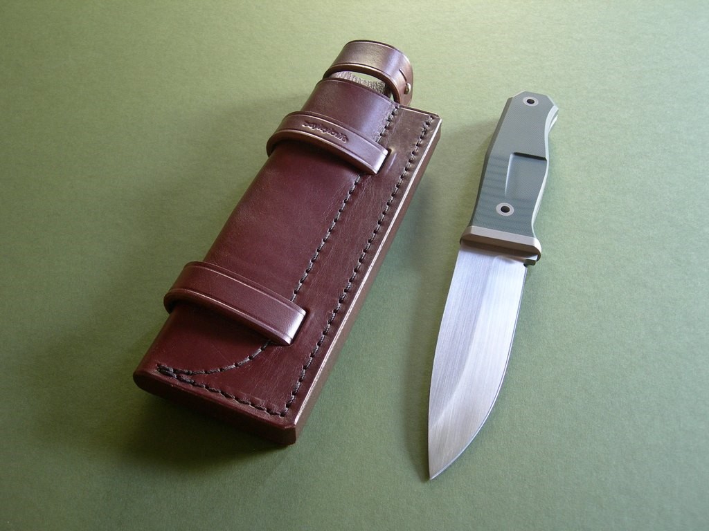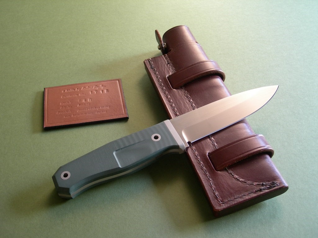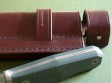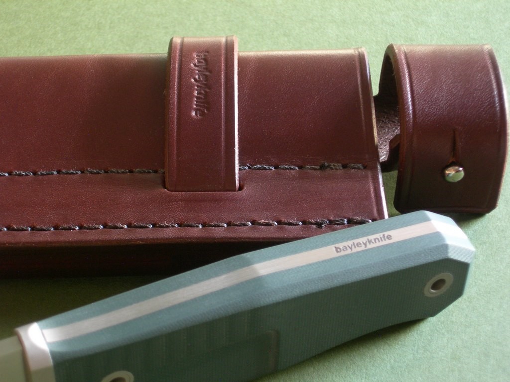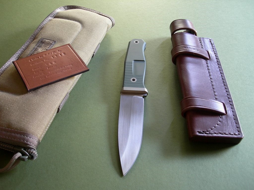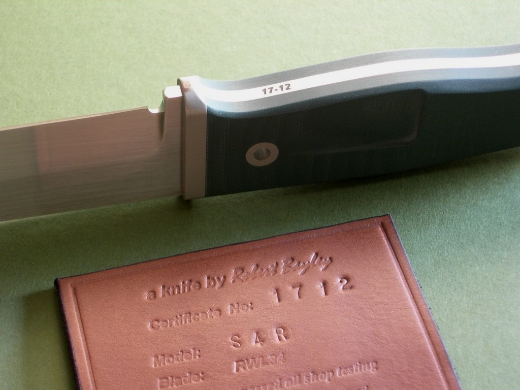 Summary: this is an original Rob Bayley S4-R "Raven". The makers signature "bayleyknife" on the upper tang, serial #17-12 on the lower tang. This knife has a 4-5/8" RWL34 blade & green G10 handle scales, comes with the original brown leather survival sheath and C.O.A.