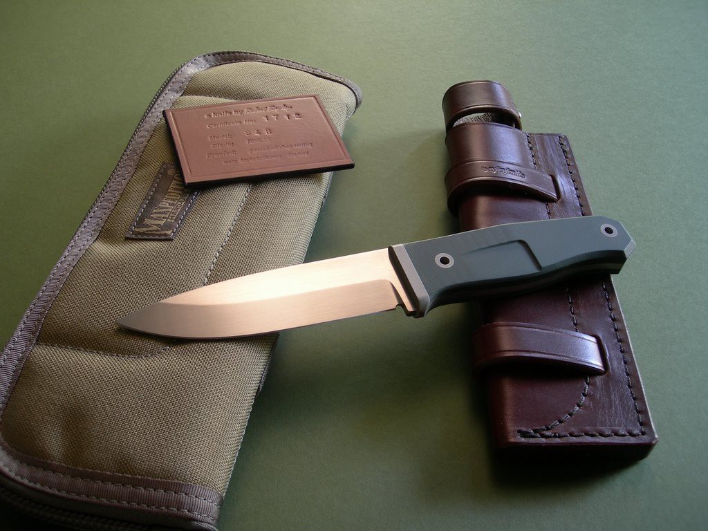 6 photos for review – as shown, a new Maxpedition carry case in included. Rob didn't make many of these Compact Raven's, they were somewhat over-shadowed by his S4's. The Raven's are outstanding bushcraft / survival knives, I've had a few requests for this model in the last year or two but never have them in stock. This is a great opportunity to pick one up with custom green G10 scales and brown Bayley-made sheath, it's one of the very first without the upper spine jimping. (see maker comments below) Suffice to say, it's the real deal and a perfect addition to any knife collection. Thanks and good luck.