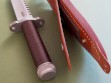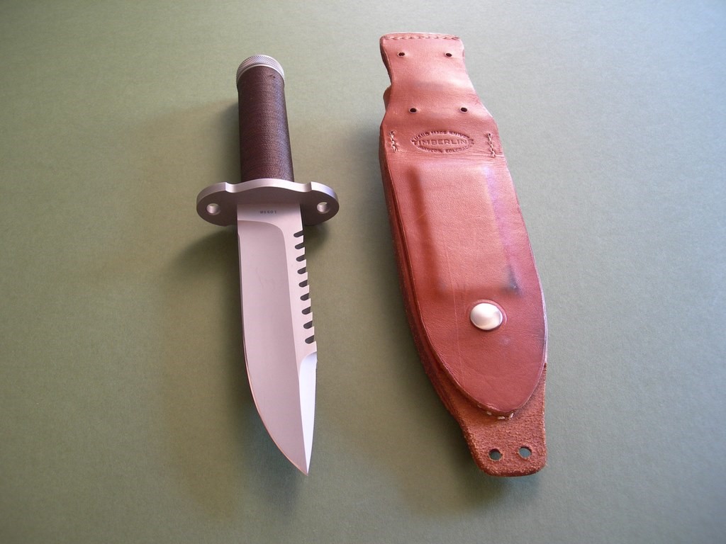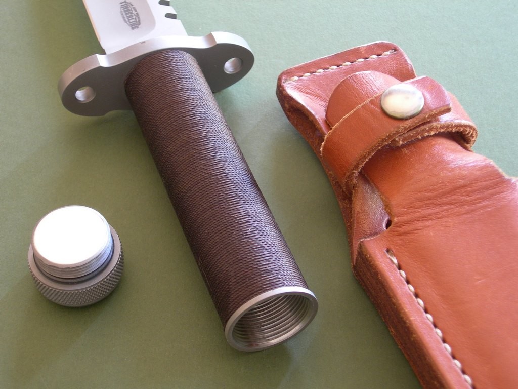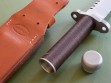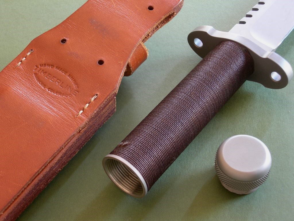 Summary: this is an original 1980's Timberline SB 5-3/4" hollow handle survival knife and original sheath. Serial #105SB, the knife is in excellent+++ or better condition, unused with original edges. There are a few very light marks on the blade, quite small and only visible in direct light. A few light scuffs on the guard that will probably buff out, I didn't want to mess with the finish and left them alone. The original brown handle wrap looks great – one very small area of abrasion on the back side near the butt cap. (see photo 7) The original pouch with survival gear still in the handle, looks like everything is there except for the two flies. Assume the basics: hooks, fishing line, sinkers, sparking flint, snare cord... everything to choke / feed / set yourself on fire if given enough time. All said and done, a very clean vintage piece in unused condition.